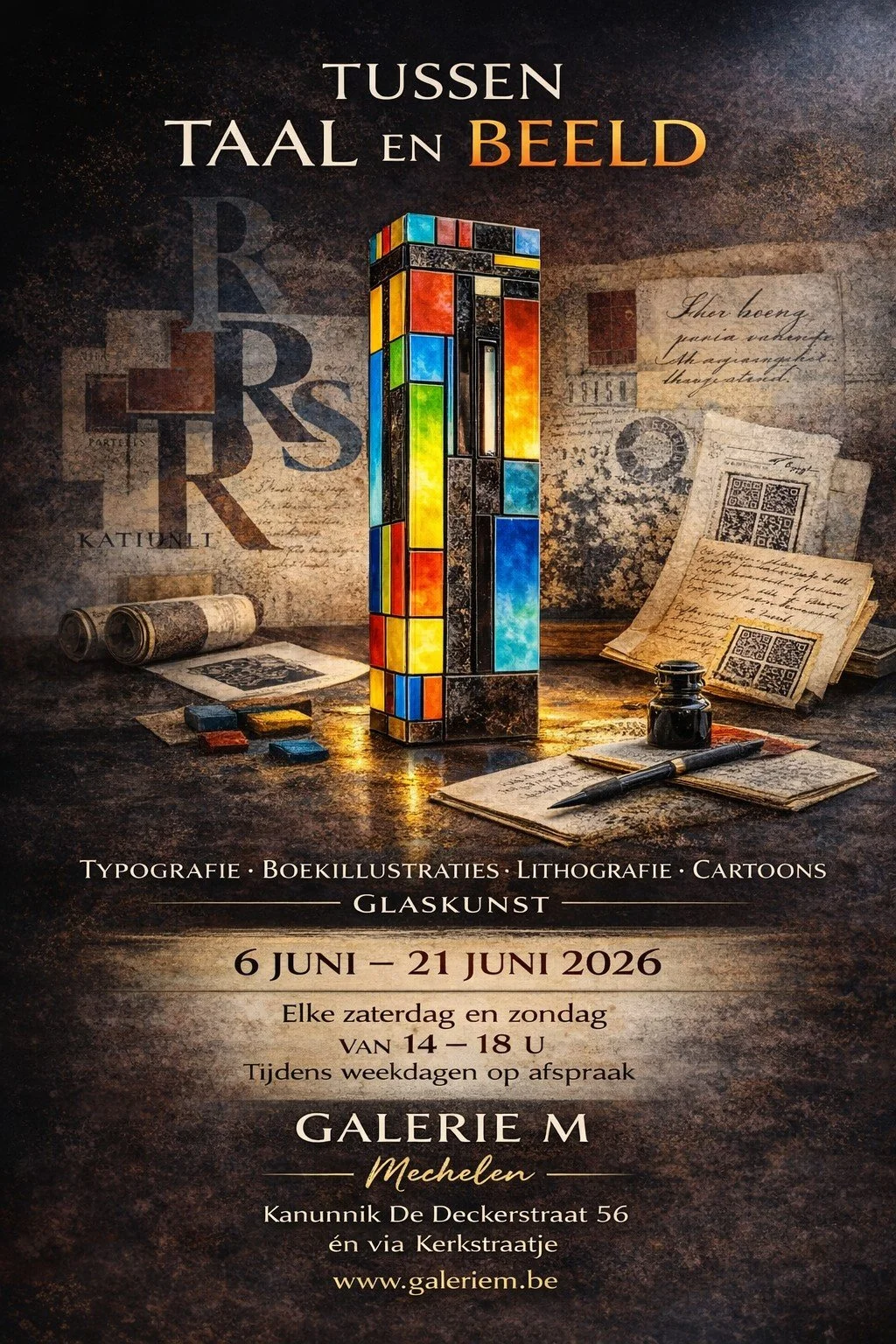 Dirk Huyghe toont originele cartoons en karikaturen die in de loop der jaren in De Standaard werden gepubliceerd. Met zijn lettersculpturen en linosneden bewijst hij dat ook letters, woorden en taal vanuit een artistieke invalshoek kunnen benaderd worden.